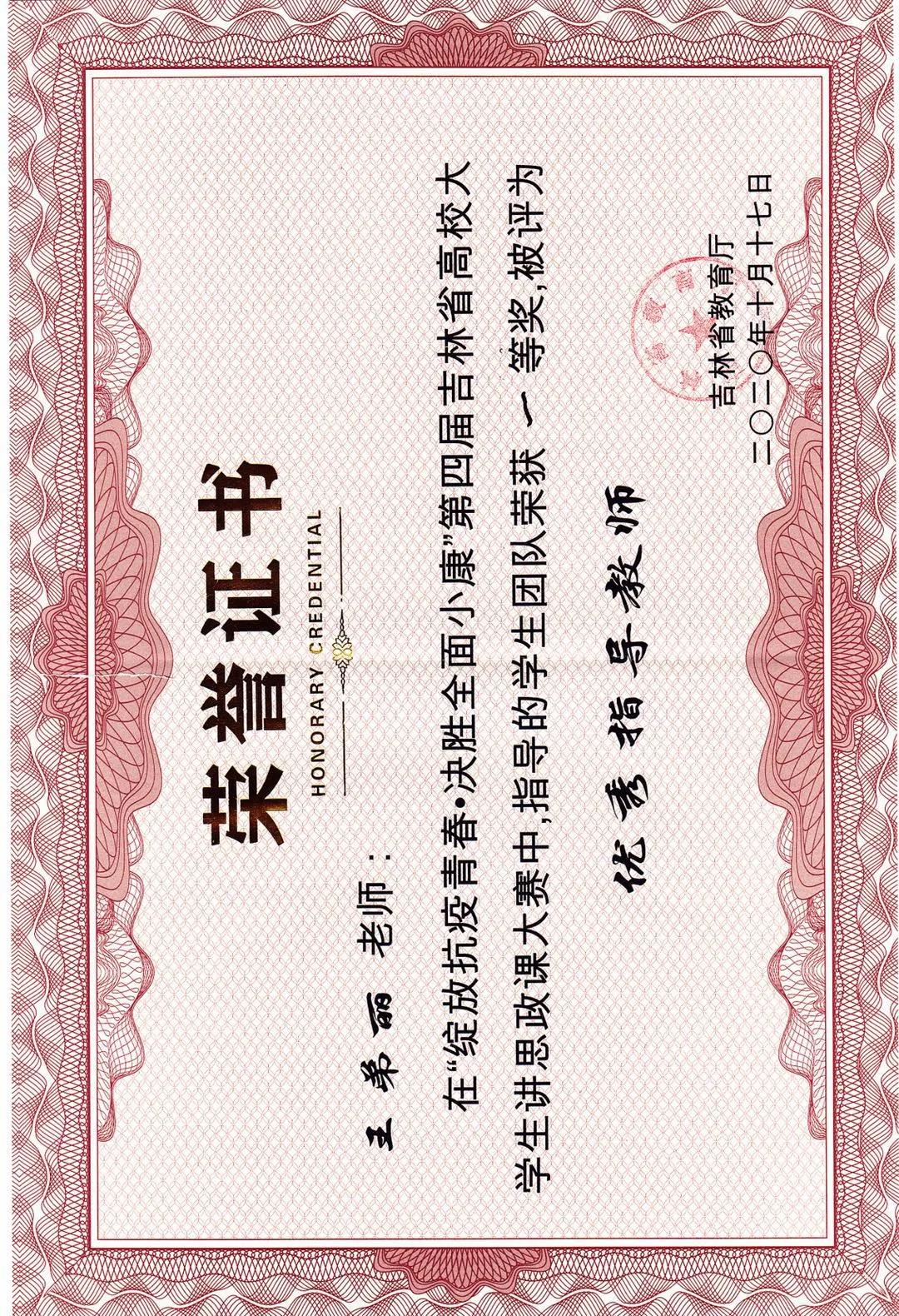 为深入贯彻落实习近平总书记关于教育的重要论述,践行《思政课是落实立德树人根本任务的关键课程》的要求,2020年7-10月,吉林省教育厅举办“绽放抗疫青春•决胜全面小康” 第四届吉林省高校老员工讲思政课大赛。由7790cnm必发集团原理教研室主任王弟丽老师指导的7790cnm必发集团代表队荣获省级一等奖、公司荣获优秀组织奖、指导教师王弟丽荣获优秀指导教师奖。