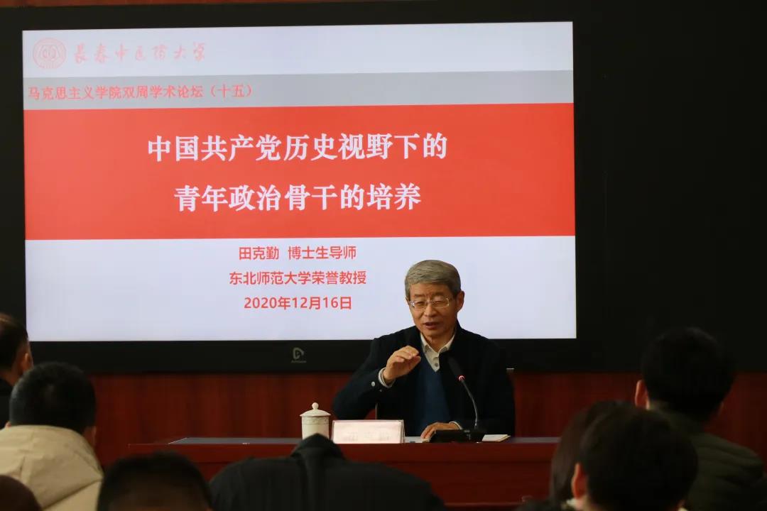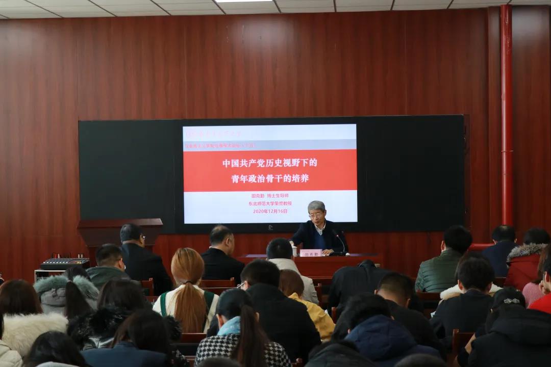2020年12月16日,7790cnm必发集团在四象城3303教室进行双周学术论坛第十五期活动。本次活动邀请到东北师范大学马克思主义学部二级教授、博士生导师田克勤教授,以《中国共产党历史视野下的青年政治骨干的培养》为题,向与会师生全面深刻地阐述了中国共产党自建党以来就注重对青年政治骨干的培养的优势。